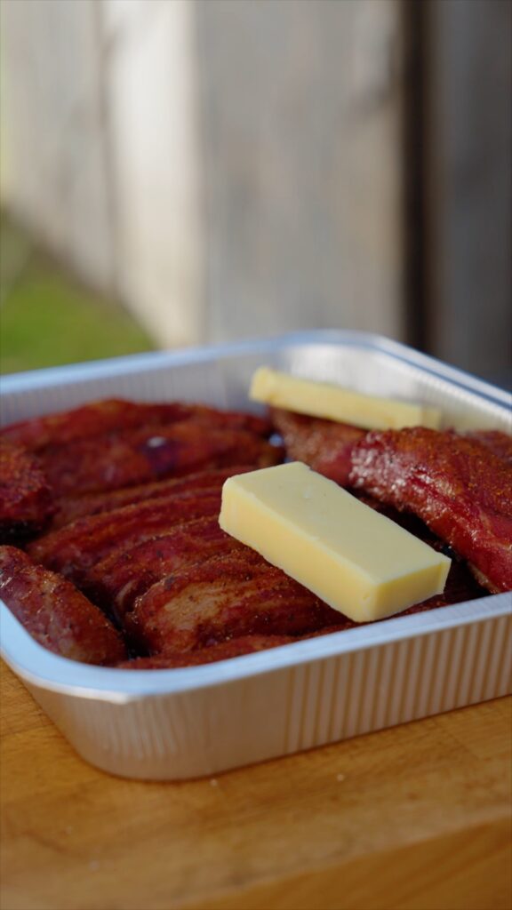 Verwarm je smoker of BBQ naar 125°C – 135°C voor indirect garen. Leg de ribbetjes op het rooster en laat roken tot ze een prachtige mahonie kleur krijgen. Dat duurt ongeveer een uur. Concentreer je vooral op de kleur van het vlees – net zoals we in ons pulled pork recept uitleggen. Als ze er goed uitzien en de bark zich mooi heeft gevormd, zijn ze klaar voor de volgende stap.