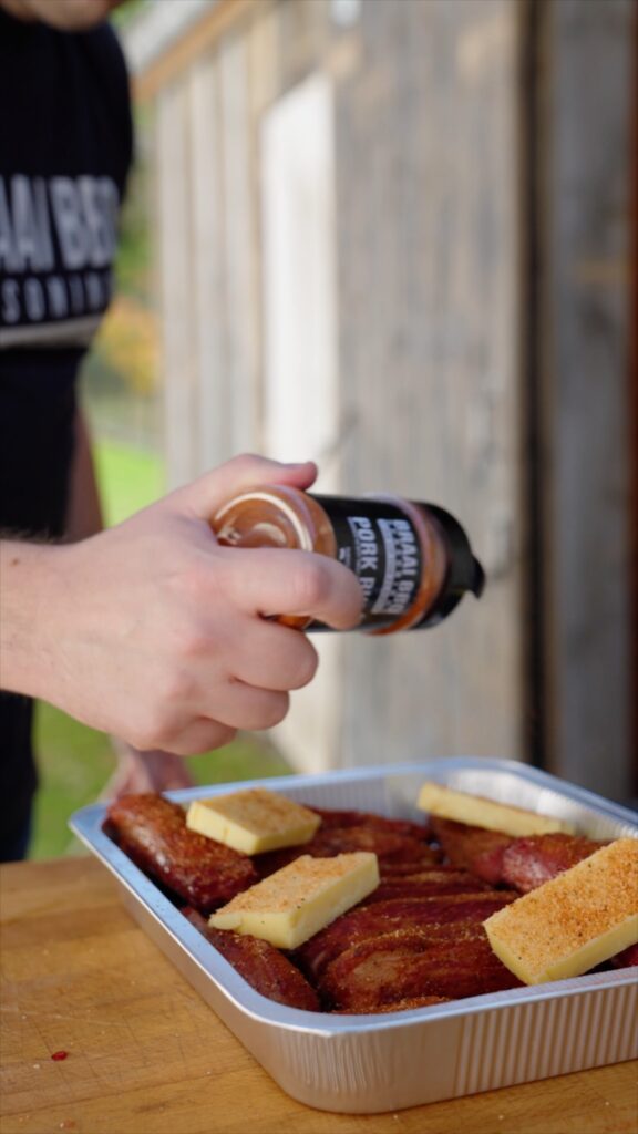 Zodra je ribbetjes die mooie kleur hebben bereikt, haal je ze van de BBQ en leg je ze in een aluminium pan. Voeg de boter toe, strooi de suiker erover (lichte bruine suiker of rietsuiker is ideaal) en nog extra Pork Rub. Drappeer rijkelijk de Barbecue Red Sauce er over. Meng alles voorzichtig door elkaar tot elk ribbetje bedekt is.