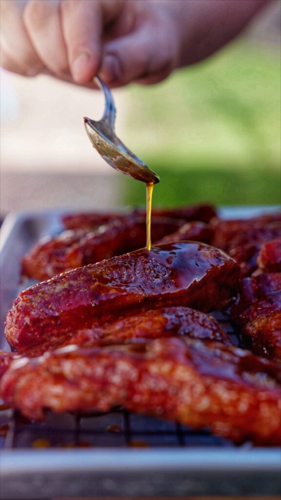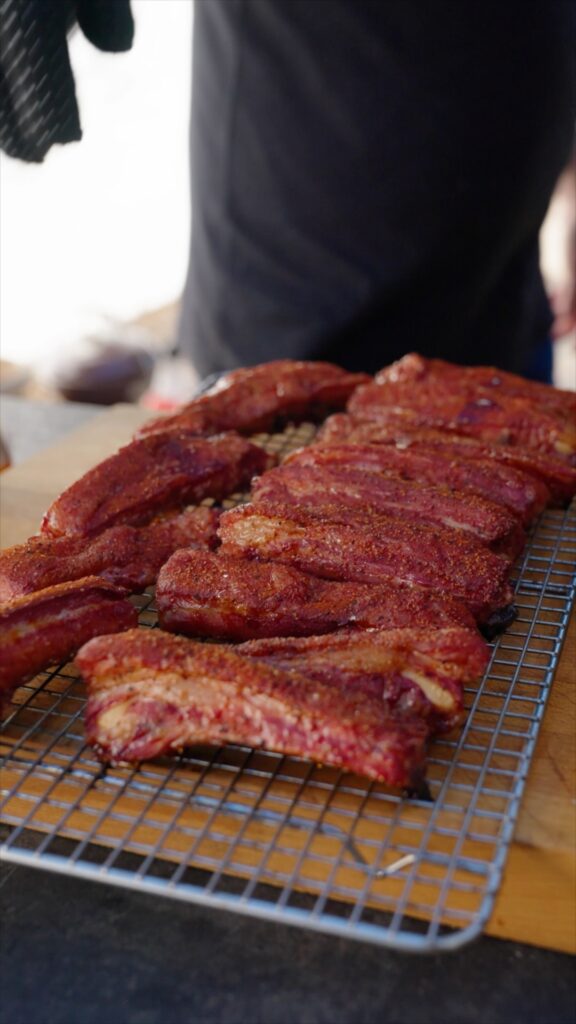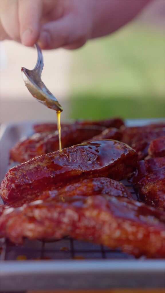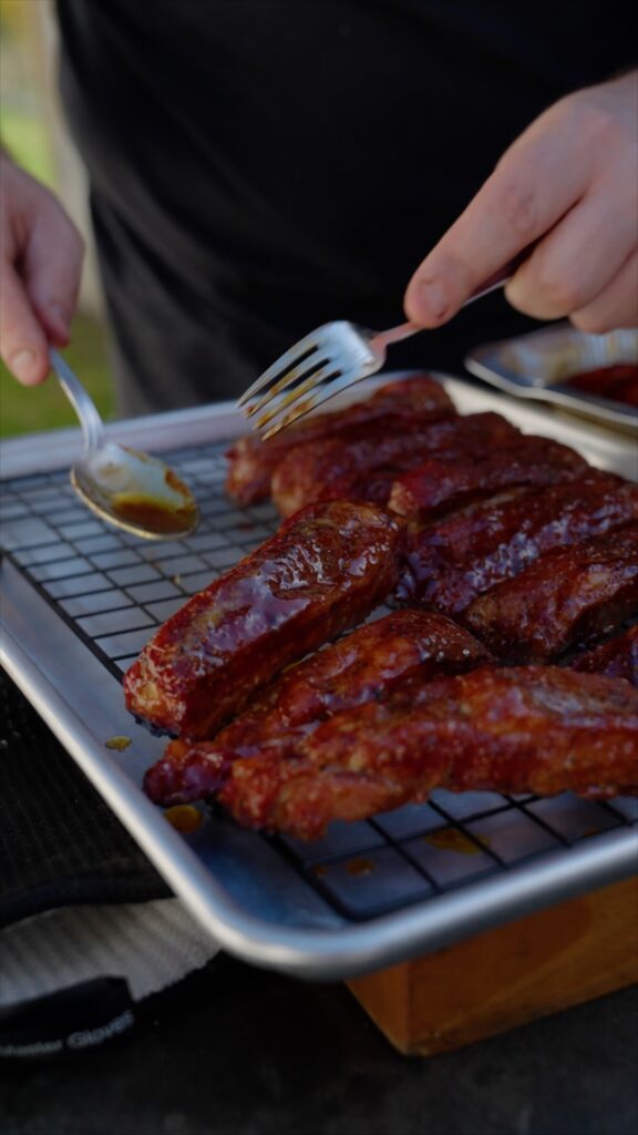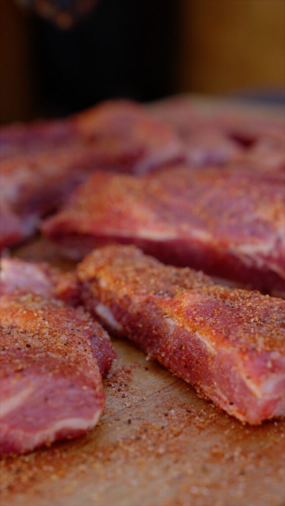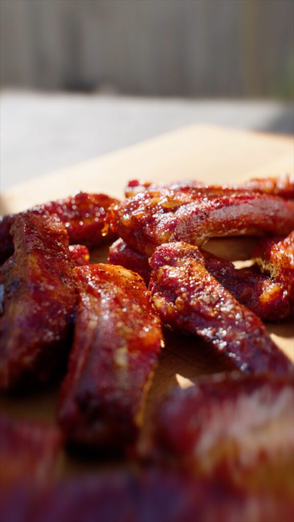Het mooie van deze methode is dat elk ribbetje aan alle kanten wordt gekruid én gerookt. Bij een volledig rack krijg je alleen de boven- en onderkant een mooie bark. Bij party ribs? Elke kant van elk ribbetje is bedekt met een knapperige, zoete en rokerige laag. Dat betekent meer smaak, meer karamelisering en uiteindelijk gewoon véél meer plezier aan tafel.