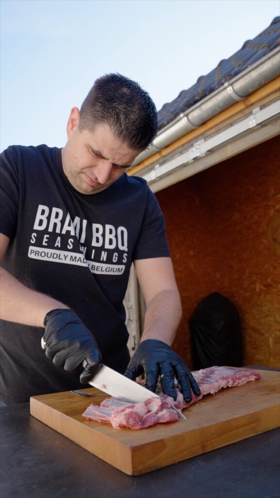 Nu komt het belangrijkste: snijd je ribs in individuele ribbetjes. Leg je rack met de bolle kant naar boven en snijd tussen elke rib door. Het lijkt misschien veel werk, maar het duurt hooguit 10 minuten en scheelt je achteraf urenlang wachten.