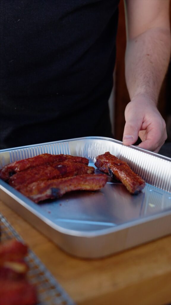 Dek de pan af met aluminiumfolie en zet hem terug op de BBQ. Laat de ribbetjes nog eens 45 minuten tot een uur garen. Het vlees moet mals zijn en botermals zijn als je er in prikt.